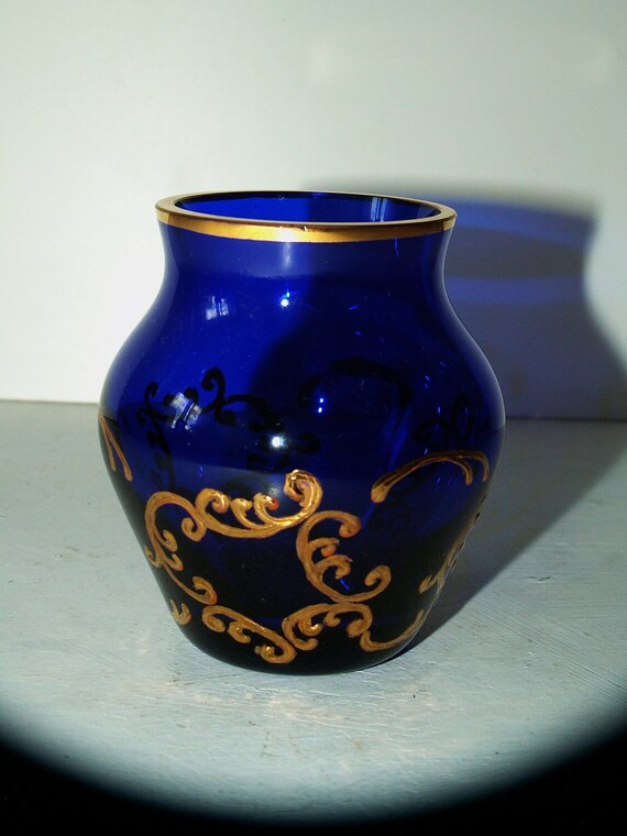 Blue Glass Vase Gold Ornaments Vintage French Glass Cup